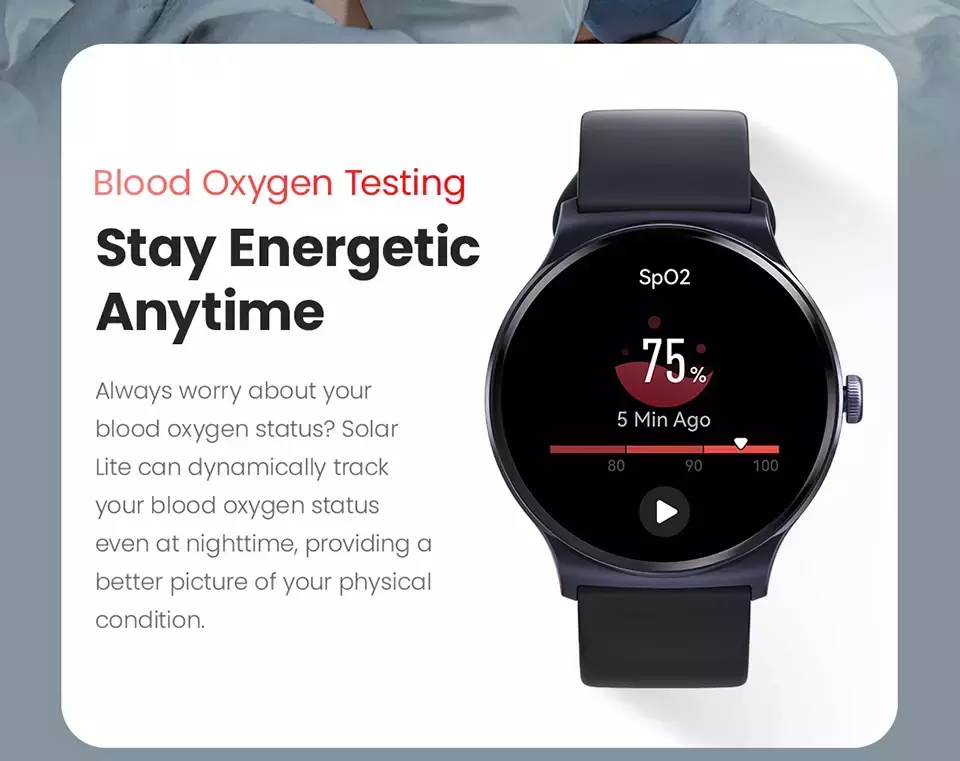 Sempre se preocupe com o oxigênio do seu sangue? O Solar Lite pode rastrear dinamicamente o status de oxigênio no sangue mesmo à noite, fornecendo uma imagem melhor de sua condição física.