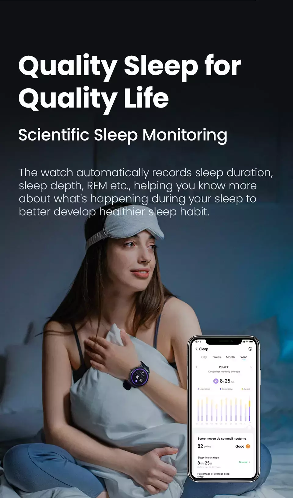 O relógio registra automaticamente a duração do sono, profundidade do sono, REM etc., ajudando você a saber mais sobre o que está acontecendo durante o sono para desenvolver melhor o hábito de sono mais saudável.