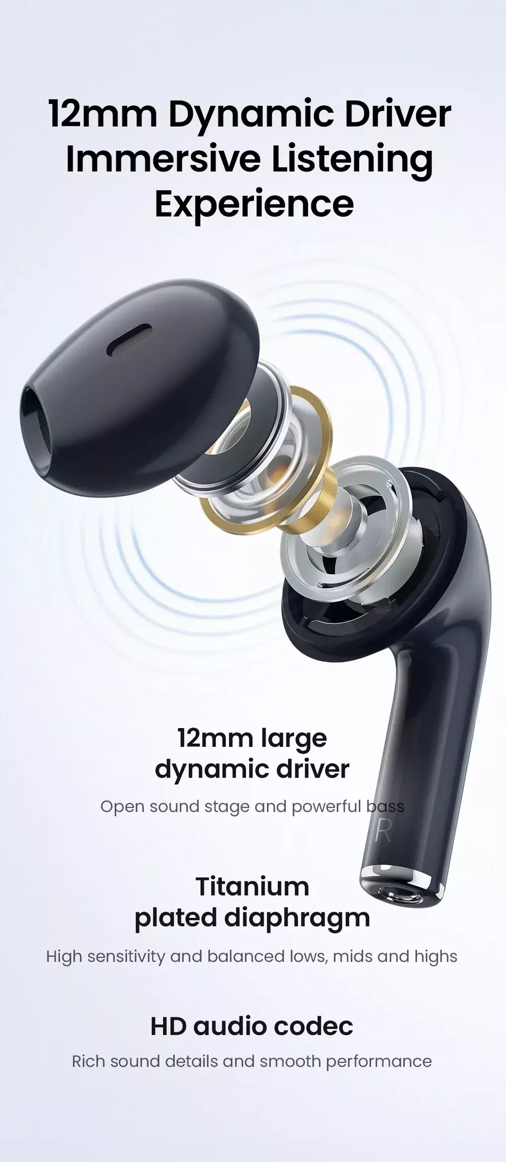 12mm Dynamic Driver Imersive Listening Experience? 12mm grande driver dinâmico (palco de som aberto e graves poderosos); Diafragma banhado a titânio (alta sensibilidade e baixos, médios e agudos equilibrados); codec áudio HD (detalhes sonoros ricos e desempenho suave)