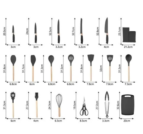 Conjunto super econômico: O conjunto de utensilios de cozinha inclui: 5 facas especiais (você pode cortar, fatiar e picar com facilidade e precisão). Tesoura, pinça, tábua de cortar e 3 escapadeiras diferentes, 3 espátulas diferentes, 2 coleres, um utensílio de cozinha pincel e um batedor para batedeira. Estes podem ser embalados em duas caixas de alojamento.