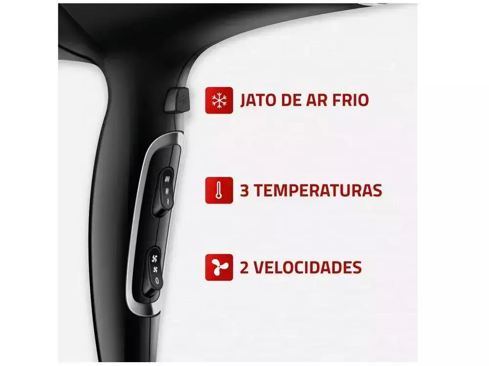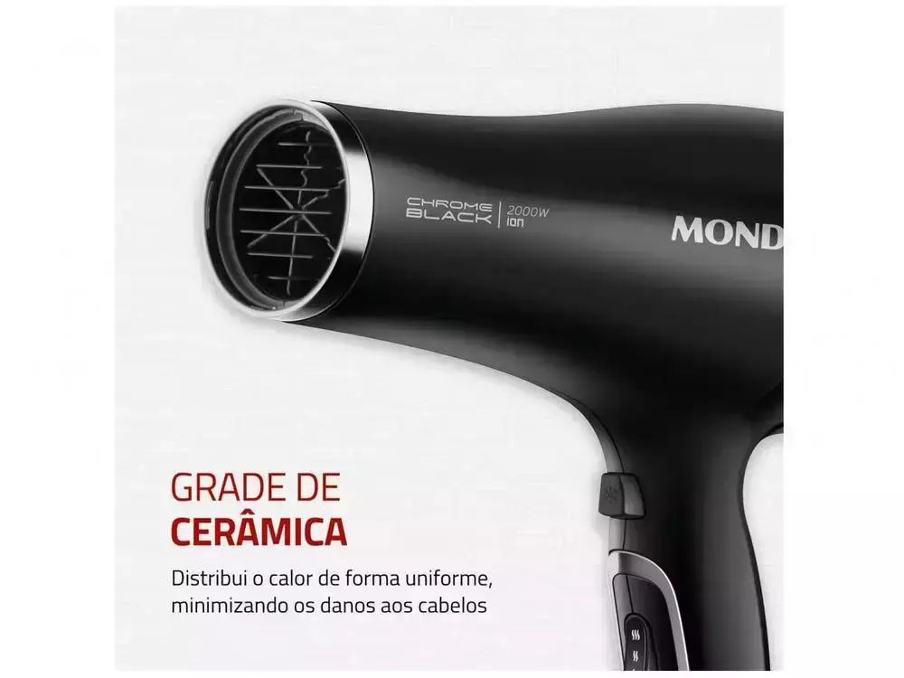 O Secador de Cabelo Chrome Black SCN-04 da Mondial é garantia de cabelos secos com maciez e brilho! O revestimento com Tourmaline Íon emite íons negativos, que fecham as cutículas dos fios e reduzem o frizz. Já a alta potência, de 2000W, proporciona uma secagem rápida e eficiente. O secador doméstico, possui 3 temperaturas, 2 velocidades e jato de ar frio: basta alternar entre as variações para uma secagem mais adequada ao seu tipo de cabelo. Além disso, com o jato de ar frio, você dá aquele choque de temperatura no final da secagem, reduzindo o frizz e ainda ajuda a fixar a modelagem. Ele vem nas cores preta e prata, conta com grade de cerâmica, por onde sai o ar e distribui o calor de forma uniforme, minimizando os danos aos cabelos. Já o bocal direcionador, concentra e direciona o fluxo de ar, proporcionando mais precisão e facilidade para modelar os fios. E a grade traseira removível, facilita a limpeza e aumenta a vida útil do secador de cabelo. Seu cabo-plugue tem 1,8 metros de comprimento, garantindo mais autonomia de movimento. A Mondial é a escolha de milhões de consumidores!