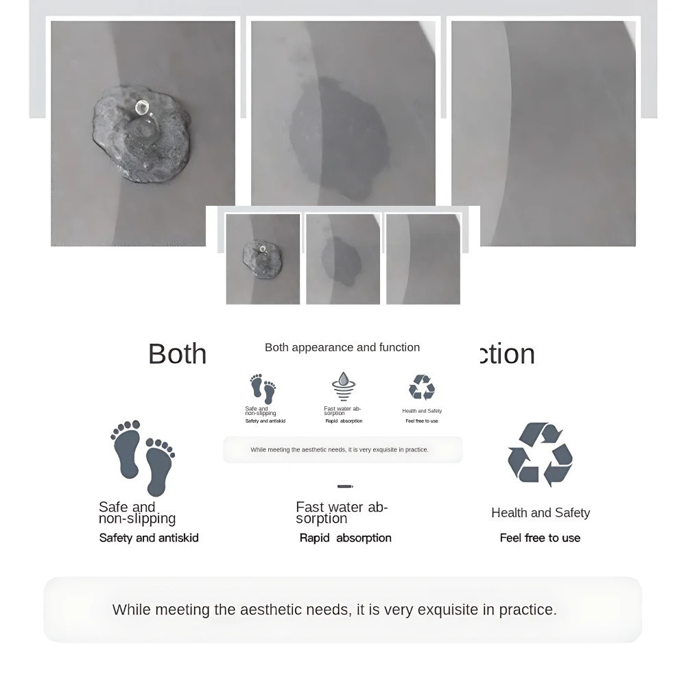 Absorção Rápida: Nossos tapetes são feitos com material diatomáceo super absorvente, projetado para absorver rapidamente a umidade, deixando o ambiente mais seco e evitando escorregões.