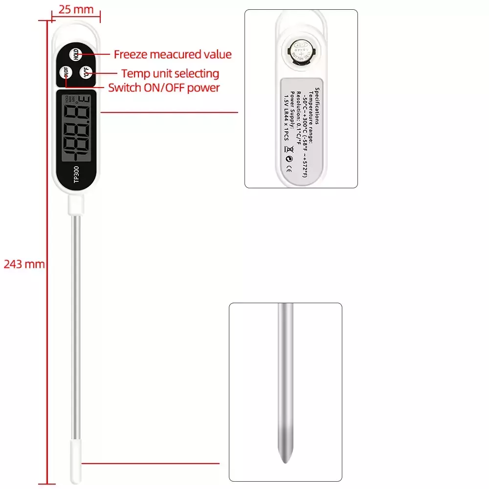Forma e produto sensível.Termômetro para sua cozinha, laboratório, fábrica ou churrasco.Bainha plástica protetora.Cor: brancoPower Source: 1 x bateria do botão AG13 Não incluídoTemperatura Faixa: -50 Celsius ~ 300 CelsiusComprimento do fio do sensor: 15cm/5,91 ''(aprox.)Tamanho do produto: 4,4 cm x 3cm x 3cm/1,73 "x 1,18" x 1,18 "(aprox.)1 x de R$87,90 sem juros | Total R$87,90 | |
